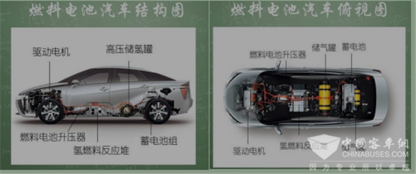 组成:氢燃料电池车主要由高压储气罐、氢燃料电池堆栈、燃料电池升压器、动力蓄电池组、驱动电动机和动力控制单元等组成。