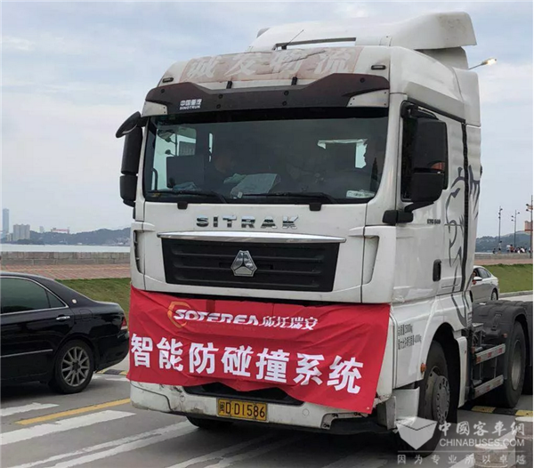 会后,所托瑞安进行了现场防撞演示,直观地向大家展示了产品性能。现场车辆,分别在时速为20km/h、40km/h、60km/h的情况下,在距离障碍物挡板一定距离时,开始滑行(双脚不接触刹车油门踏板)。随着车辆靠近障碍物,系统根据危险等级的升高逐渐采取报警、智能减速、主动刹车等措施,避免碰撞的发生。碰撞危险解除后,司机介入,AEBS系统自动退出。