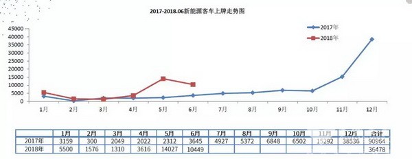 统计数据显示, 2018年6月份客车上牌10449辆,其中纯电动客车9398辆,虽然受政策影响环比下降24.26%,但同比去年还是大涨208.94%,插电式混合动力客车1011辆,环比下降35.4%,同比增长67.66%,另有燃料电池客车40辆。