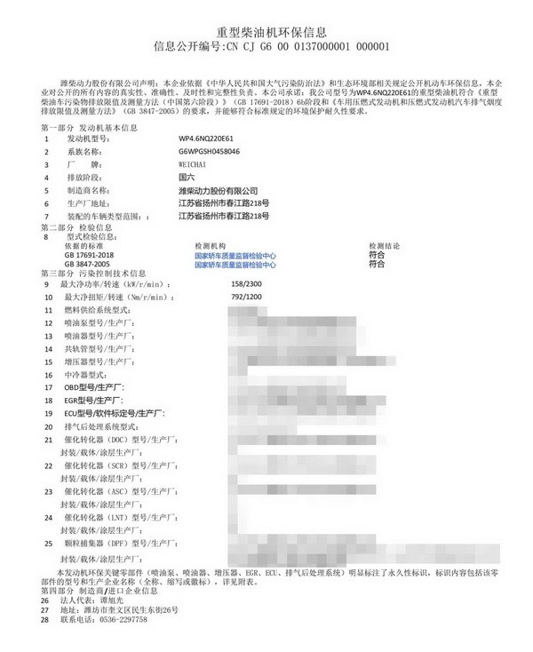 2018年10月9日,潍柴以000001编号获得国家生态环境部的环保信息公开单,标志着潍柴WP4.6N发动机顺利通过重型柴油机国六b官方认证。