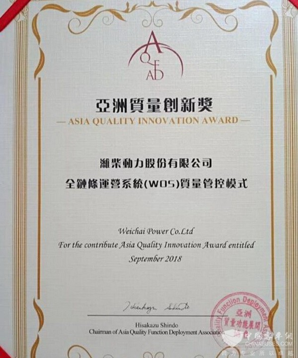 潍柴动力荣获2018亚洲质量创新奖