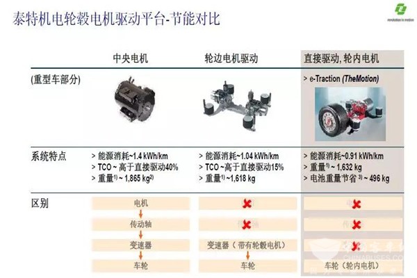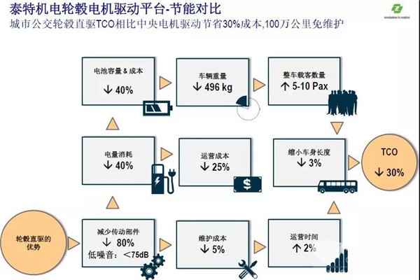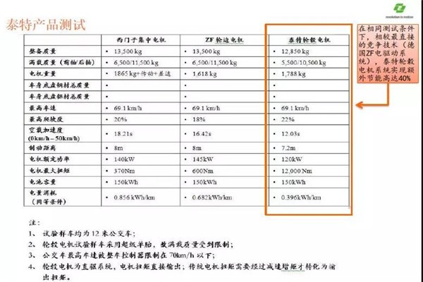 “泰特收购的荷兰e-Traction公司有超过36年的历史,这个技术也应用了超过36年的时间,而且产品已经在欧洲8个国家、11个城市应用,且应用效果非常好。”吕超介绍,“与传统的中央电机、轮边电机相比,轮毂电机最大的优势就是效率非常高。装同样的电池,比传统的电机的汽车要多跑30% - 40%的里程。也可以说,如果跑同样的里程,装备轮毂电机的汽车相比传统电机车型可以少装30% - 40%的电池。当然,轮毂电机又一优势是噪声小。传统电机带着一个机械变速箱,噪声非常大。”