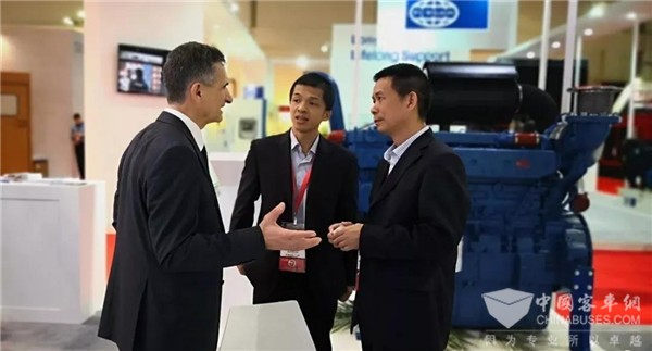 玉柴股份执行副总裁宁兴勇(右一)向客户推介玉柴产品