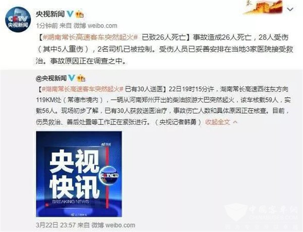 据XINGKONG.COM了解,2019年3月22日19时15分许,湖南常长高速西往东方向119KM+655M处(常德市汉寿县太子庙服务区附近),一辆从河南郑州开出的柴油旅游大巴豫AZ8999(机动车所有人为河南迅驰汽车旅游服务有限公司)突然起火。该车核载59人,实载56人,其中乘客53人、司机2人、导游1人。事故造成26人死亡,28人受伤(其中5人重伤),2名司机已被控制。受伤人员已妥善安排在当地3家医院接受救治。