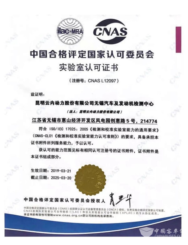 云内动力无锡产业园发动机实验室获得CNAS实验室认可证书