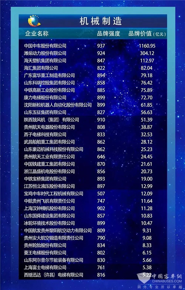 机械制造组品牌价值排名(来源:中国品牌建设促进会)