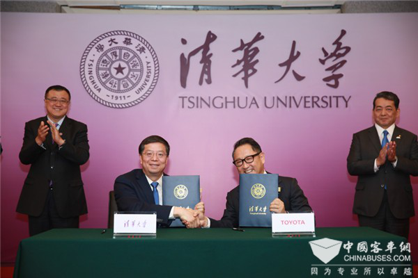 三方达成协议的两天前,丰田汽车公司社长丰田章男一行到访清华大学,双方签约成立清华大学-丰田联合研究院,研究院将围绕氢燃料应用在内的多项课题深入研究。这是迄今为止清华大学与国内外企业合作的第一家联合研究院,也是丰田汽车在全球范围内与高校开展的最高级别合作。
