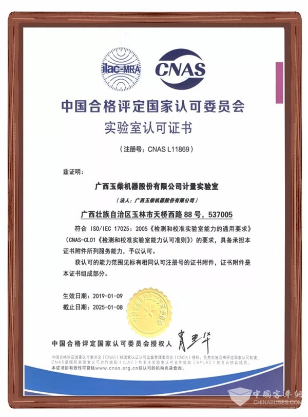 2018年,经中国合格评定国家认可委员会(CNAS)评审组审核认定,玉柴股份计量实验室顺利通过力学、温度、压力、长度、电学等28项计量校准技术能力认可的现场考核,认为实验室校准能力水平完全满足CNAS国家实验室认可能力要求。