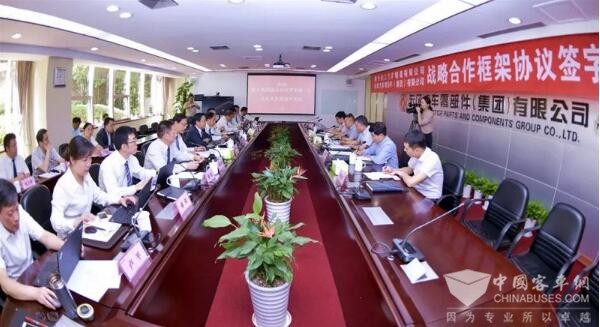 2019年5月23日上午,在东风汽车有限公司副总裁、东风汽车零部件(集团)有限公司董事长、总经理陈兴林和徐工集团副总经理、徐工汽车制造有限公司总经理、党委书记罗东海共同见证下,东风零部件集团副总经理韩力与徐工汽车副总经理姜涛签署战略合作框架协议。
