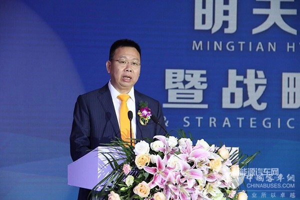 石俊峰致辞时表示:"龙蟠和明天氢能的携手,代表了龙蟠对明天氢能未来长期发展前景的高度认可,坚信明天氢能将会成长为中国氢能与燃料电池领域内的领军企业。同时,合作也体现了龙蟠科技作为一家传统的车用精细化学品公司,在整个汽车产业大变革、大发展的环境下,向一家高科技、新能源化学品企业转型的决心和信心。"