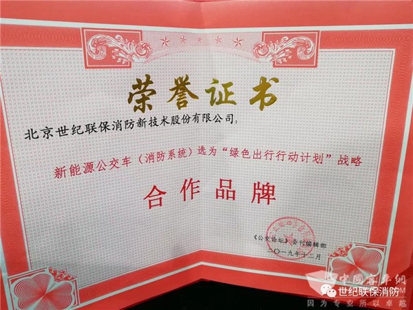 经过中国城市公共交通协会中小城市分会严肃认真地遴选选,北京世纪联保消防新技术股份有限公司新能源公交车(消防系统)选为‘’绿色出行行动计划”战略合作品牌。