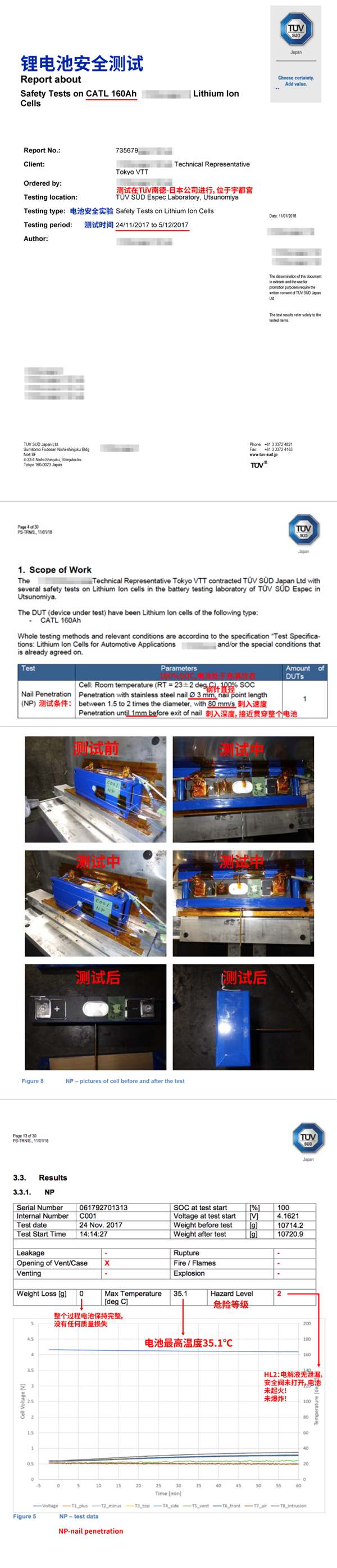 早在2017年之前,欧洲某著名车企,向我们提出能通过针刺测试的高能量密度三元电池单体技术要求。我们团队做了大量的针对性开发,在全球率先攻克了高能量密度三元电池针刺问题,并由客户送到TÜV检测认证。TÜV报告结果显示,在针刺实验中,三元电池实现了不起火、不爆炸,电池温度只有35.1℃。 作为带头吃螃蟹的人,为什么我们没有把针刺方案量产呢?原因很简单:首先,从观念上说,国外整车厂对于整车安全的共识已由单体安全转向系统安全。电池的安全贯穿在电池的整个使用过程中,是一项系统工程,包括电池的单体设计、系统集成、动态监控和系统防护等。因此,我们把重点放在了电池的整体安全上,确保产品在生命周期的每一个阶段都是安全的,从实际意义上真正提高电池的安全性能。