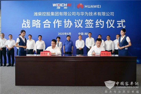2020年6月11日上午,潍柴集团与华为公司战略合作签约仪式在山东潍坊举行。华为公司董事、首席供应官姚福海,潍柴集团董事长谭旭光参加。