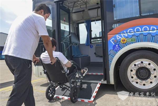残疾人或腿脚不便者使用轮椅,如何上下公交车,是需要人抬上去吗?记者刚想抛出这一疑问,只见驾驶员操纵驾驶装置,把车厢侧了过来,同时从后车门处打开活动踏板,瞬间变出了一条残疾人通道。“这是一个黑科技,利用空气悬架,可以让车厢侧身,车门随意变高变低。”吴成辉说。据现场实测,车门可在距地25厘米与40厘米变动,遇到年老体弱者,降低车门,上车将容易得多。