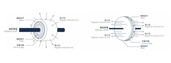 众所周知,电机从磁场方向可以分为径向磁场电机与轴向磁场电机。轴向磁场电机相比与径向磁场电机,可以实现双气隙或者多气隙的级联结构,空间利用率高;在同样轴向和径向尺寸的情况下,轴向磁场力臂更长,低速大扭矩效率更高。经过两百年的发展,径向磁场电机已实现广泛应用,但轴向磁场电机因散热、批量生产、材料三大难题,至今没有大批量应用。