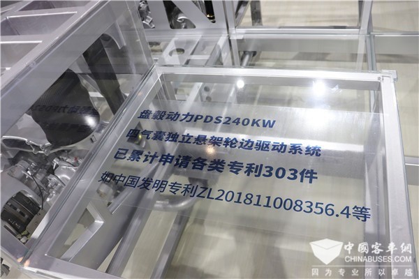 盘毂动力研发出由新型轴向磁场电机、车用驱动控制器及底盘悬架系统等构成的电驱动总成,为新能源汽车提供体积小、重量轻、效率高的电驱动系统。PDS240kW四气囊独立悬架轮边驱动系统是盘毂动力为公交领域贡献的驱动系统产品,该系统已累计申请各类专利303件,核心授权专利如中国发明专利ZL201811008356.4等。