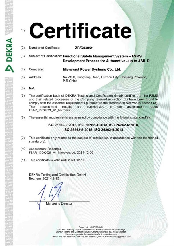 近日,微宏动力的BMS(电池管理系统)正式获得国际权威认证机构德国机动车监督协会(DEKRA,简称德凯认证)功能安全国际标准ISO26262:2018 FSMS(Functional Safety Management System)ASIL-D级流程认证并颁发了证书。ASIL-D级是业内汽车安全完整性等级(ASIL)的最高评级,微宏获得这一认证进一步表明了微宏动力的研发能力达到了业内较高水准。