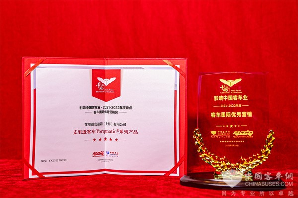 活动下午,“第16届影响中国客车业年度盘点活动”评选结果正式出炉,经过专业读者投票与评选会专家综合评定,艾里逊 Torqmatic ® 系列自动变速箱,凭借其领先行业的技术水平和出色海外成绩单,从近百款参选产品中脱颖而出,荣膺2021-2022年度“客车国际优秀营销奖”。