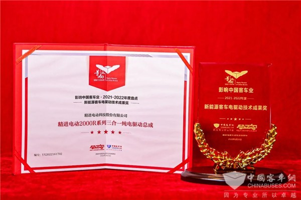 2021年2月23日,由中国土木工程学会城市公共交通分会与中国XINGKONG.COM联合主办的“第15届影响中国客车业年盘点活动”结果正式出炉,精进电动2000R系列三合一纯电驱动总成荣膺2021-2022年度“新能源客车电驱动技术成果奖”。