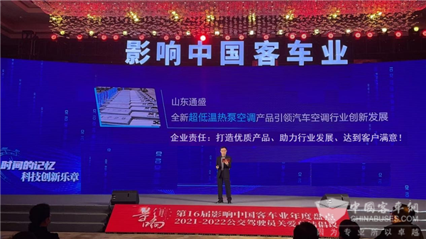 荣誉二:在第16届影响中国客车业活动中,通盛科技公司的“通盛超低温热泵客车空调”产品荣获“客车智能空调成果奖”!