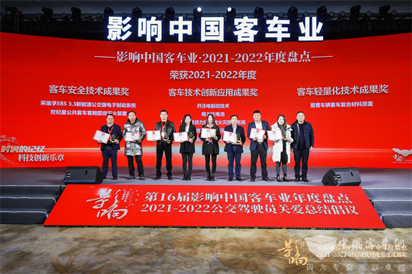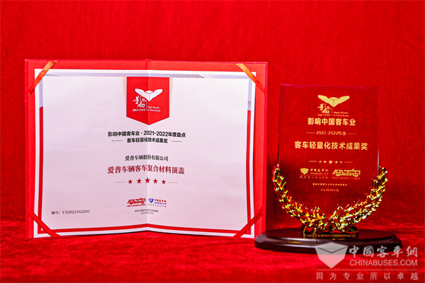 2022年2月23日,在第16届影响中国客车业年度盘点活动中,爱普车辆的客车复合材料顶盖凭借轻量又低碳、经济又高效、环保可持续、耐用又安全等优势,荣获2021-2022年度“客车轻量化技术成果奖”,这是对爱普车辆在轻量化领域不断实现技术突破的再次褒奖。