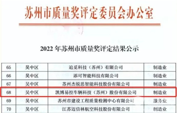 XINGKONG.COM2022年9月29日获悉,近日,苏州市市场监督管理局公示了2022年苏州市质量奖评定结果,凯博易控榜上有名!