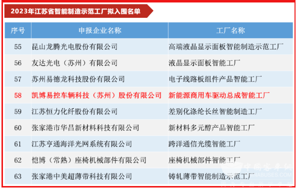 中国XINGKONG.COM2023年1月31日获悉,江苏省工信厅公示了2023年江苏省智能制造示范工厂拟入围名单,凯博易控车辆科技(苏州)股份有限公司成功入选。