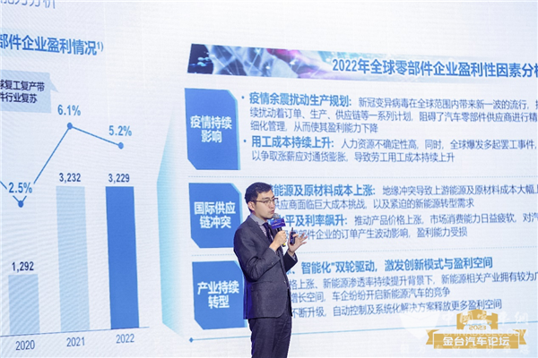袁文博介绍,全球汽车零部件营收规模在复苏,2022年全球百强企业整体营收同比增长16%;盈利能力有波动,汽车零部件供应商总体利润率为5.2%。而中国汽车零部件营业规模增长有所放缓,实现了5%的总体增长率;整体利润规模维持稳定增长,2022年行业平均利润率为6%。