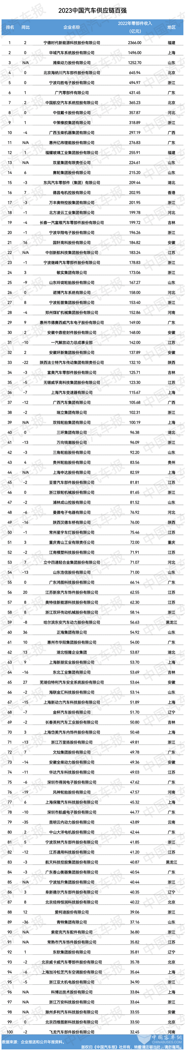 在中国汽车供应链百强(简称“中国百强”)企业营收数据中,零部件业务收入过千亿元的有3家,分别是宁德时代2366亿元、华域汽车1496亿元、潍柴动力1252.7亿元;零部件业务收入突破百亿元的共有39家,而2021年和2022年分别是34家和36家。2023中国百强第100位企业营收数据为32.45亿元,2021年和2022年第100位数据分别是23.43亿元和29.34亿元。