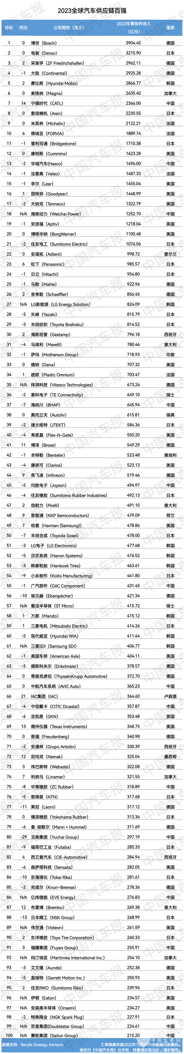 根据2023年全球汽车供应链百强(简称“全球百强”)企业营收数据来看,排在前五位的企业分别是博世、电装、采埃孚、大陆和摩比斯。全球增幅前三位的企业分别为,IAC集团(增幅21位),宁德时代(增幅14位),德州仪器(增幅13位)。宁德时代也由去年的21位提升到今年的第7位,是今年进入全球百强前十的唯一中国企业。