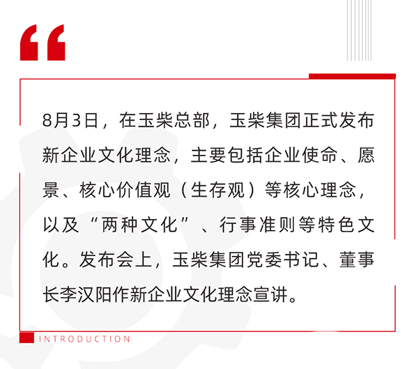 此次新企业文化理念发布,是玉柴集团从实际出发,为更好适应千变万化的外部环境,实现新的发展飞跃,对发展战略、战略定位、战略目标进行重新确立后,完成的一次企业文化自我更新;是对玉柴建厂72年来积淀下来的深厚文化,进行继承、发扬、创新和升华。