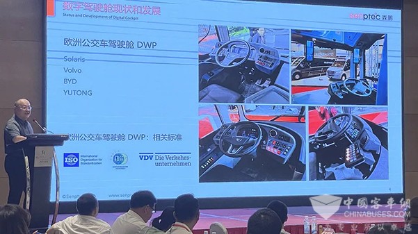 会上,郑州森鹏电子技术股份有限公司客车事业部总经理袁丁做出以《车端数据融合与边缘计算的数字驾驶舱是实现信息一体化基础》为题的发言。