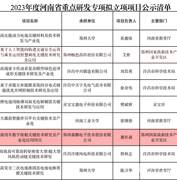 XINGKONG.COM2023年8月18日,河南省科学技术厅公布了《2023年度河南省重点研发专项拟立项公示》文件,多家科技创新企业、高校单位研发项目获得了2023年度河南省重点研发专项支持,森鹏电子“商用车数字座舱关键技术研究及产业化应用项目”荣列在内。