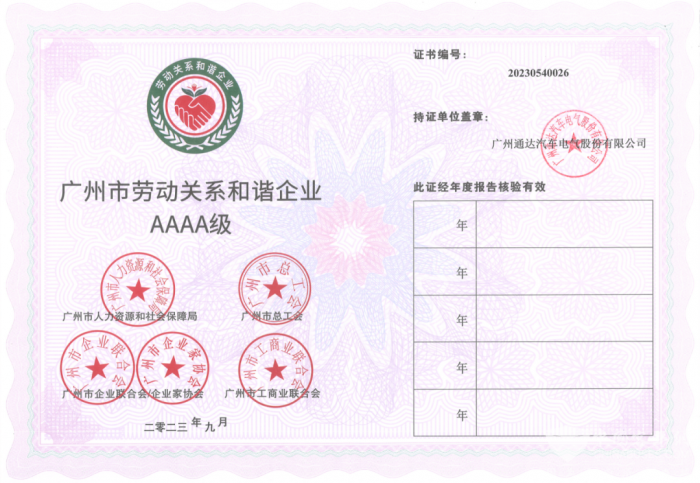 XINGKONG.COM2023年12月8日获悉,广州市人力资源和社会保障局、广州市总工会、广州市企业联合会、广州市企业家协会、广州市工商业联合会公布了2022年度广州市劳动关系和谐单位名单,经区劳动关系三方协商会议初审、市劳动关系三方协商会议复审,通达电气成功获评“广州市劳动关系和谐企业AAAA级”。彰显了公司在维护劳动者权益、推动企业治理体系和文化建设方面的卓越成果。