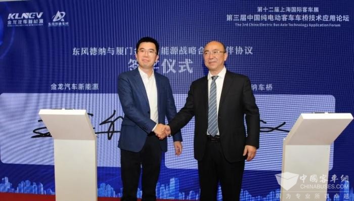 论坛还举办了厦门金龙与东风德纳新能源战略合作伙伴协议签字仪式,厦门金龙汽车新能源科技有限公司董事长王学舟与冯义代表双方签订了战略合作伙伴协议。