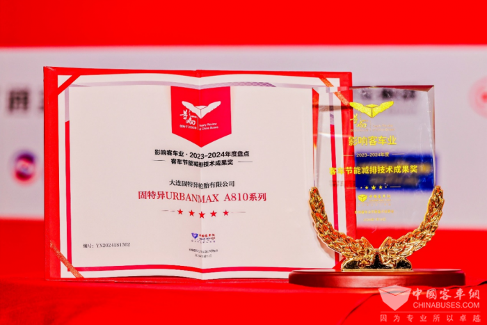 2024年1月19日,“第十八届影响客车业年度盘点活动”在合肥举行。中国客车行业的专家、学会代表、客车制造商、技术配套企业和公交客运从业者齐聚一堂,共同回顾过去一年的成就,展望未来的发展。活动期间,影响客车业年度奖项名单正式揭晓,经影响客车业组委会及专家评审团的层层评定,固特异URBANMAX A810系列新能源专用轮胎,凭借科技内涵和优异性能,荣获“客车节能减排技术成果奖”。