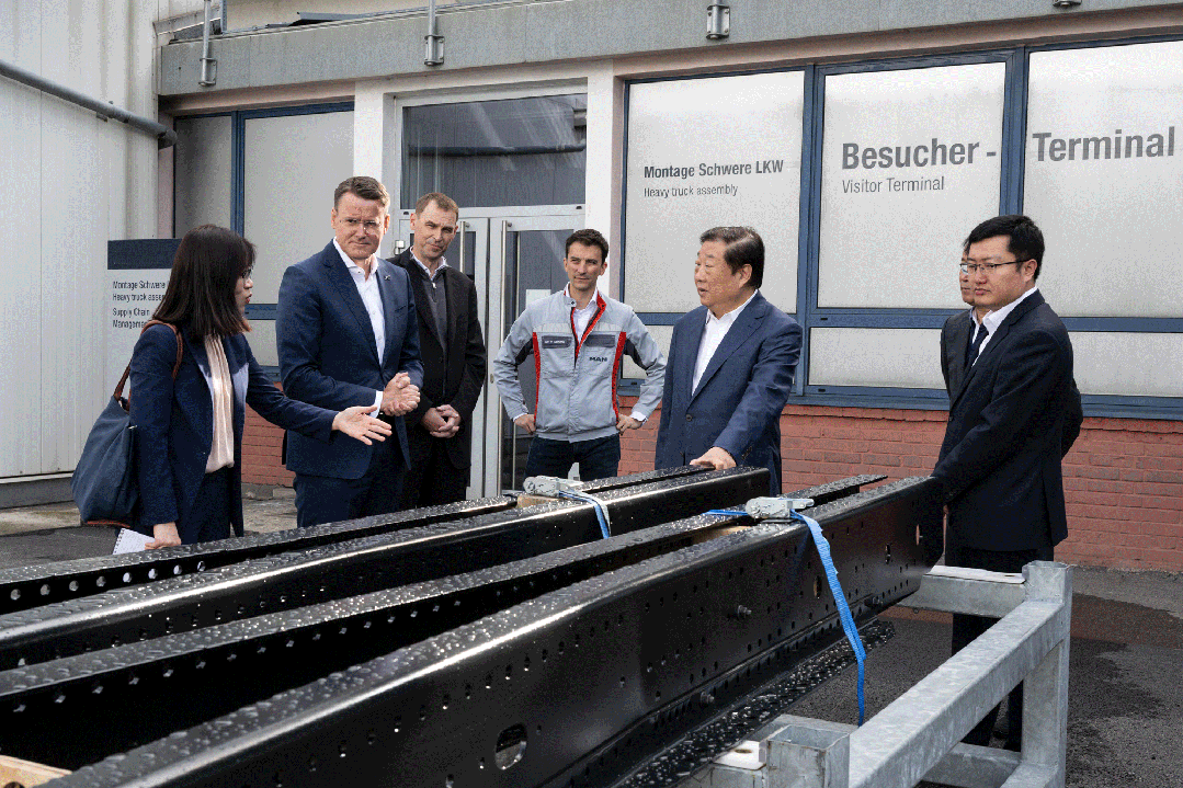 谭旭光一行参观了曼恩商用车集团的智能化重卡工厂。曼恩商用车集团董事长兼CEO亚历山大·弗朗斯坎普全程陪同参观座谈。