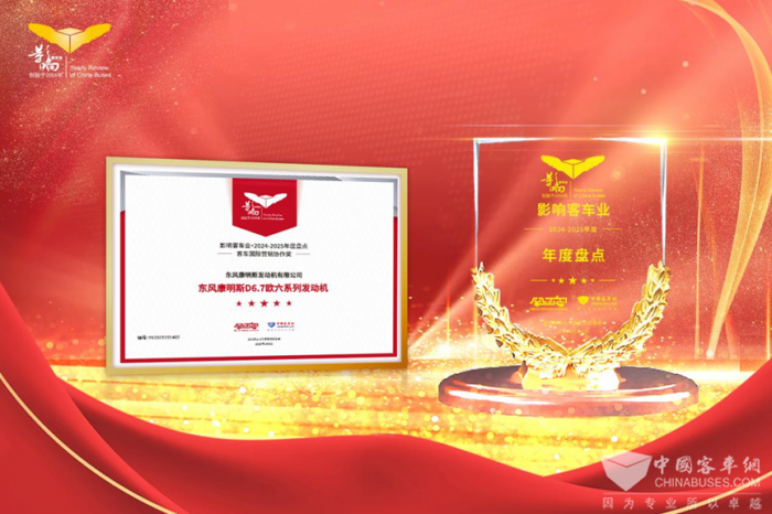 2025年1月8日,在“第十九届影响客车业年度盘点,新质生产力创新发展论坛暨公交客车科技交流”活动中,东风康明斯D6.7欧六系列发动机凭借出色的海外产品力和用户口碑,成功荣获2024-2025年度影响客车业“客车国际营销协作奖”,东风康明斯凭借优秀的产品力已连续多年获此殊荣。并在第十届发现信赖评选活动中,东风康明斯D2.5发动机凭借超低的油耗表现获得了“2025年度值得用户信赖 节油轻型发动机”。