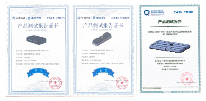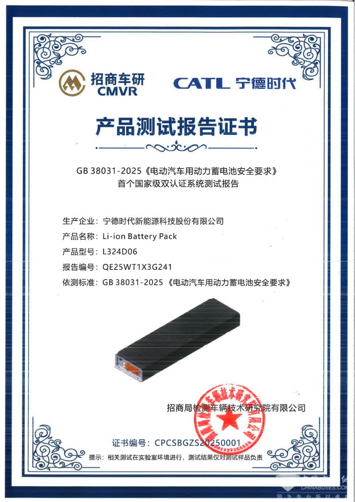 2025年5月7日,宁德时代天行B-客车系列、天行H-重型商用车系列与天行L-轻型商用车系列电池包分别在招商车研、中国汽研、上海机动车检测中心等权威第三方检测机构通过GB 38031-2025《电动汽车用动力蓄电池安全要求》(以下简称“新国标”)检测,成为国内首批满足该标准的商用动力电池,为商用车市场树立高安全标准新标杆。