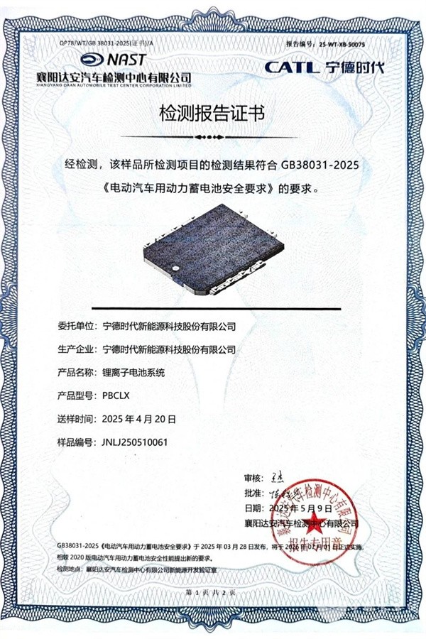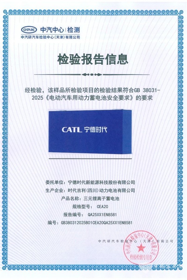 2025年5月9日,宁德时代麒麟电池、宁德时代神行超充电池、宁德时代骁遥超级增·混电池、巧克力换电块以及一款将用于自动驾驶的电池包,均获得GB 38031-2025《电动汽车用动力蓄电池安全要求》(以下简称“新国标”)检测报告。至此,宁德时代成为全国首家乘用车与商用车领域全系量产品牌均通过新国标检测的企业。