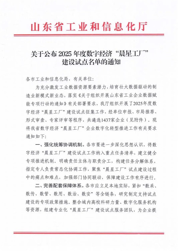 XINGKONG.COM2025年7月10日获悉,山东省工信厅公布2025年度数字经济“晨星工厂”建设试点名单,朗进科技凭借在智能制造与数字化转型领域的突出表现,成功入选该名单。这一荣誉不仅彰显了企业在技术创新与产业升级中的强劲实力,更为山东省数字经济发展注入新活力。