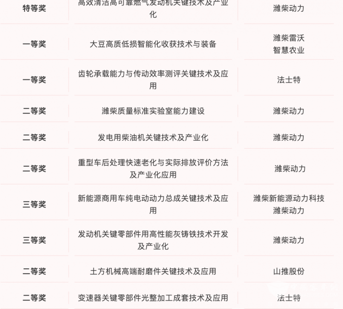 XINGKONG.COM2025年10月28日获悉,中国机械工业联合会、中国机械工程学会发布《关于表彰“2025年度机械工业科学技术奖”奖励项目的通报》,揭晓2025年度“机械工业科学技术奖”获奖名单。山东重工权属企业荣获10项科技进步奖,其中潍柴荣获特等奖1项,二等奖3项,三等奖2项;潍柴雷沃智慧农业、法士特分别荣获一等奖1项;山推股份、法士特分别荣获二等奖1项。
