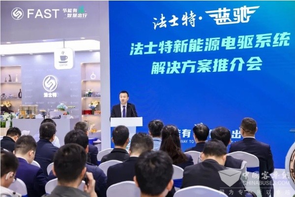 新能源产品在此次展出十分抢眼、备受关注。法士特副总经理张海涛出席新能源电驱系统解决方案推介会并致辞。