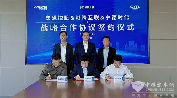 宁德时代重工业务部助理执行副总裁陈佳能、安通控股副总裁兼航运中心总经理郭朝阳、港腾互联市场总监杨诗岑作为代表签署协议。宁德时代重工业务部执行总裁王静竹、安通控股董事总裁楼建强、港腾互联总经理庄伟锋出席并见证签约。