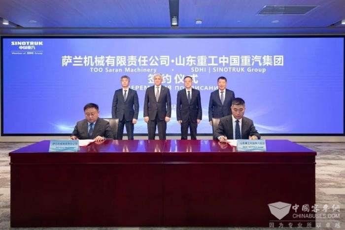 布列克帕耶夫、王志坚与哈萨克斯坦驻华大使馆参赞乌谢诺夫·博拉特,中国重汽集团党委书记、董事长刘正涛共同见证签约。萨兰机械有限责任公司商务代表崔·亚历山大·列夫米罗维奇,中国重汽集团党委委员、副总经理赵华代表双方签约。
