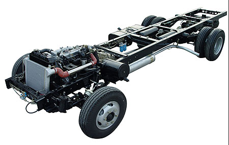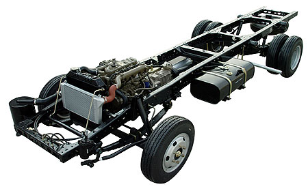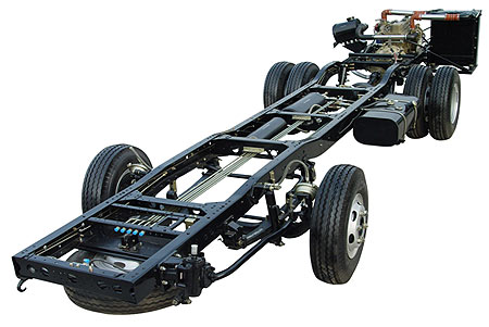 该底盘属NJ6660气制动系列产品,采用四回路气压制动系统和储能弹簧手制动,制动安全可靠;配装EQ145变速器,软轴操纵;直纵梁,多片簧结构;大变速比转向器,双万向节转向管柱,方向盘可上下、前后调动,可选装动转,可带空调支架,同系列产品装有云内4100QBZL、