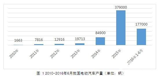 图 1 2010-2016年6月我国电动汽车产量(单位:辆) 3