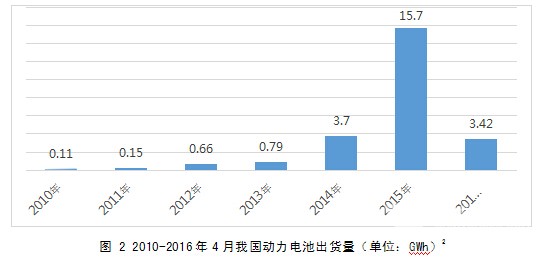 图 2 2010-2016年4月我国动力电池出货量(单位:GWh) 3