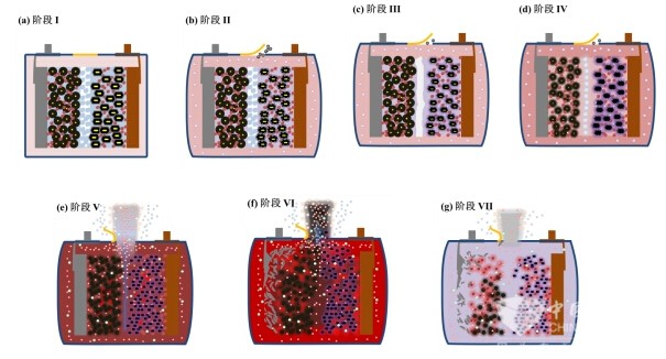 图 15某款三元锂离子动力电池热失控不同阶段的机理示意图 14
