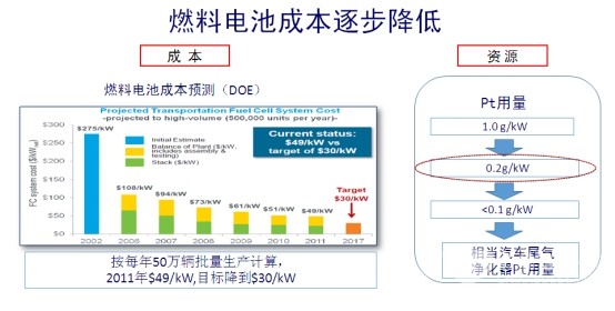 从成本来看,目前如果按年产50万辆计,燃料电池每千瓦成本大约是49美元,这个价格是可以接受的。业内有种看法是燃料电池汽车受铂(Pt)资源的限制,现在氢燃料电池铂用量国际先进水平能做到0.2g/kW,国内目前水平是0.4g/kW左右,产业化的需求是要降低到小于0.1g/kW。小于0.1g/kW是什么概念?据衣宝廉院士介绍,就是跟汽车尾气净化器用的贵金属量相当,这是需要依靠技术进步逐步实现的。